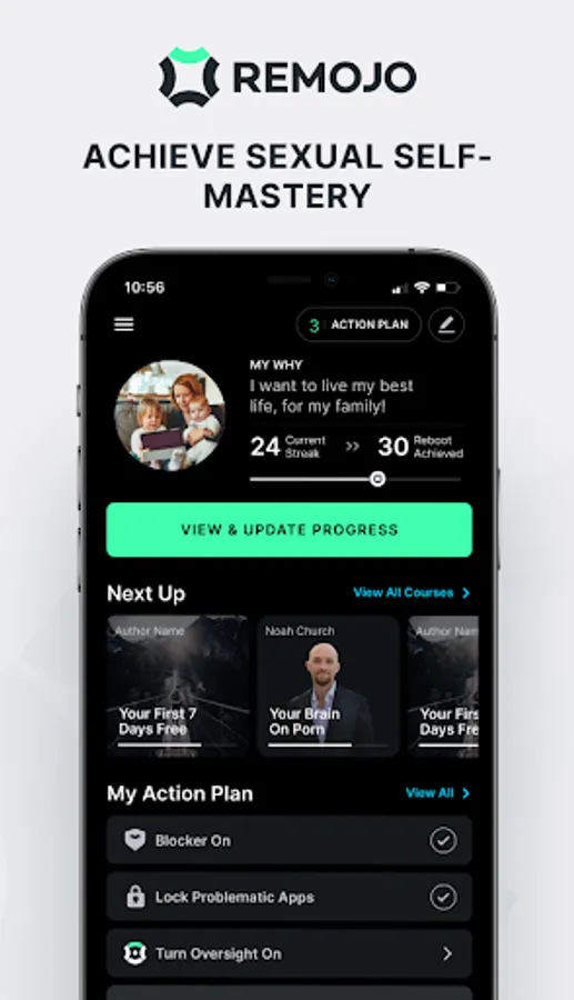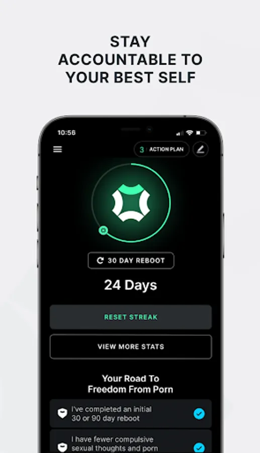 - Progress: Track your pornfree streak as you progress towards your reboot goals