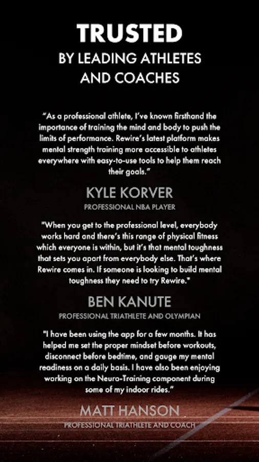 Our Mindset Recovery system uses scientifically proven protocols to optimize your mind and body to prepare, perform and recover. The different protocols used in Rewire are also used individually by elite athletes, Navy SEALS, and high-performing individuals around the world. For the first time, Rewire has combined all of these protocols into a single comprehensive system.