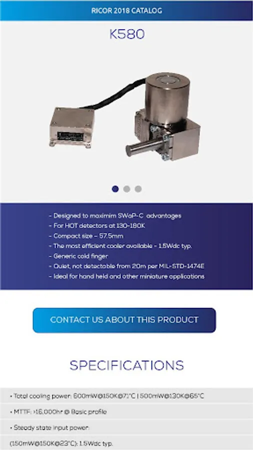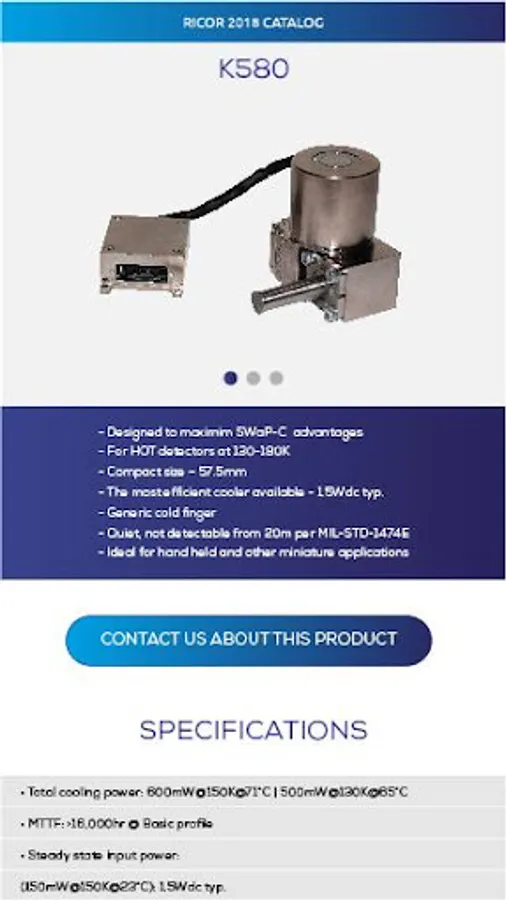 Ricor’s 2019 catalog of advanced miniature cryogenic cooling solutions including Integral Rotary, Split Rotary and Split Linear miniature cryocoolers with an easy-to-use search feature that includes technical and general search.