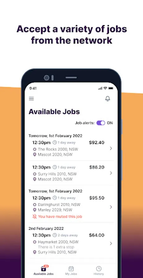 Easily manage your day through the web or mobile app where you can view your own available jobs, accept jobs from the network and see your job past history. With trip details being accessible from the palm of your hand you are free to focus on providing a quality service to your customers.