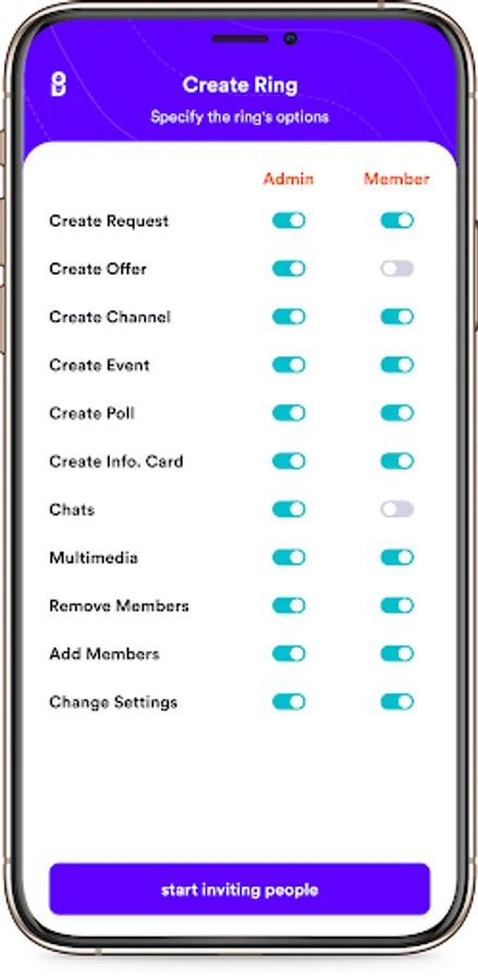 Another important aspect of the app is control. A user can not only create a group but control what activities can be performed in a group e.g. a user can disable forwarding of messages in a group or disable chat altogether i.e. group (or ring) will be used for purpose like request and offer only.