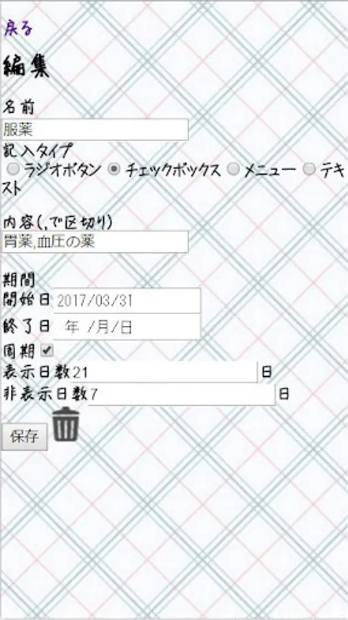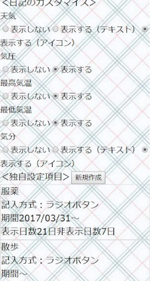 Customize items are radio buttons, check boxes, menus, text and fill method, further fill period and ○ days there is a washout period, such as display after ○ days non-display can also record of medication!
