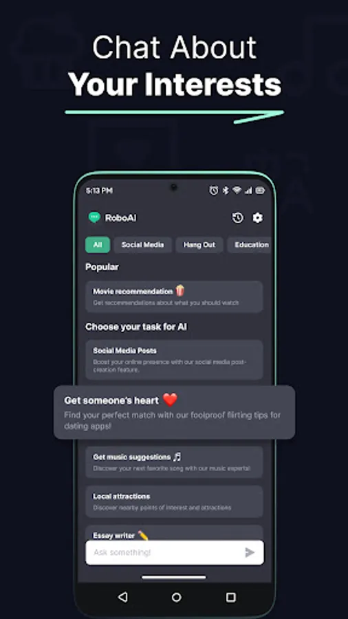 - Engage in exciting conversations about your interests using ChatGPT technology.