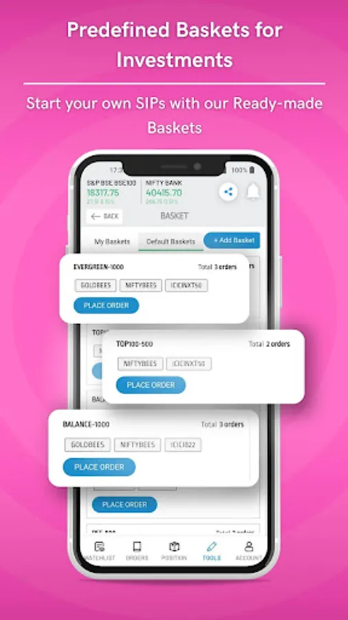 - Use Basket Order to send multiple orders in different securities. Also enjoy predefined baskets invest thru SIP’s