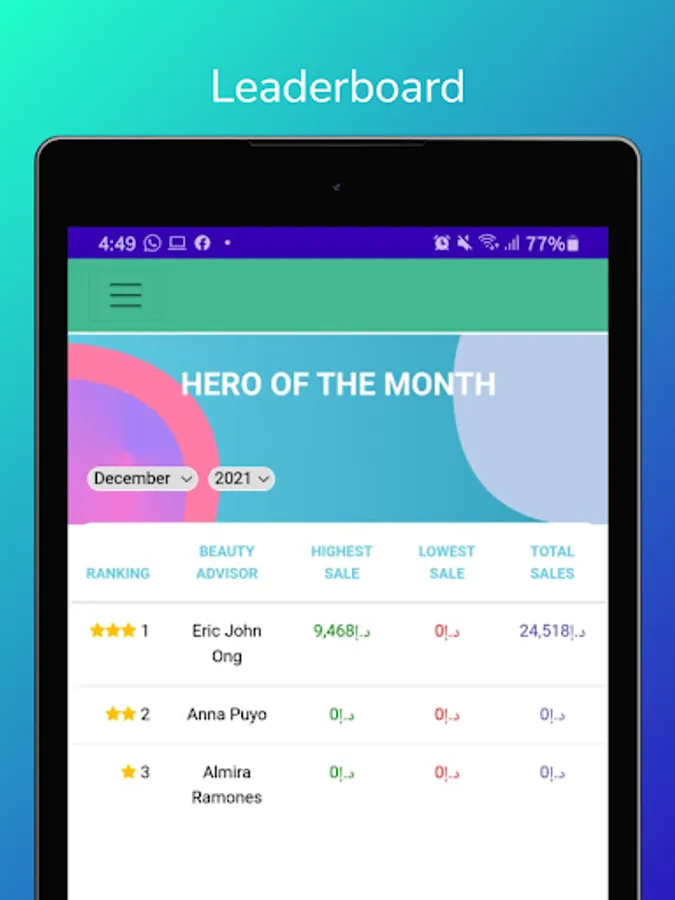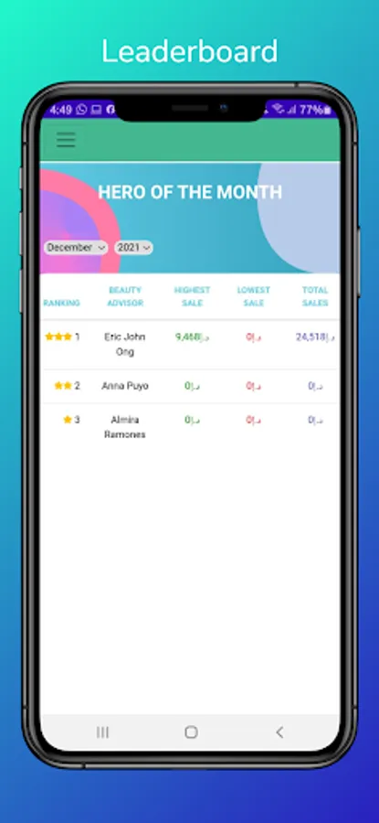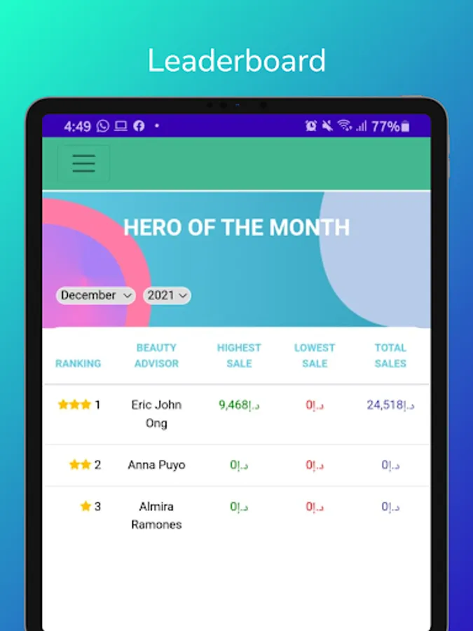 The leaderboard shows the position and ranking of a salesperson so that a manager can know the performance. With a leaderboard, a manager can identify the performance indicators and set expectation levelling in order to get a competitive advantage.