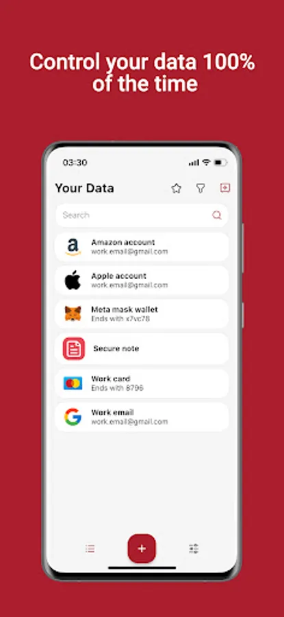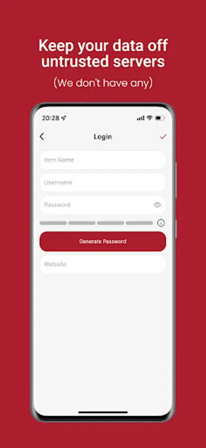 We believe the only safe storage for your digital data is on your phone and not hosted on a remote cloud server. Sacret securely encrypts, stores, and manages your data. This means that you control your data 100% of the time. All you have to do is remember your master password.