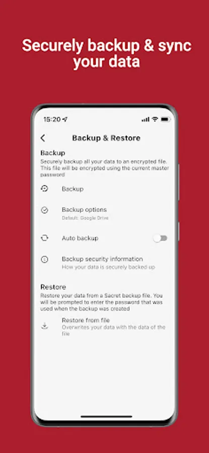 You can backup, restore and sync your data to an encrypted file or a cloud provider. This backup is encrypted before being uploaded, so the cloud service will only have a version of your bank level encrypted backup. It is important to us that only you can access and are in complete control of your data.