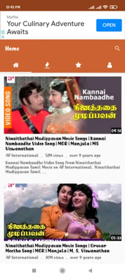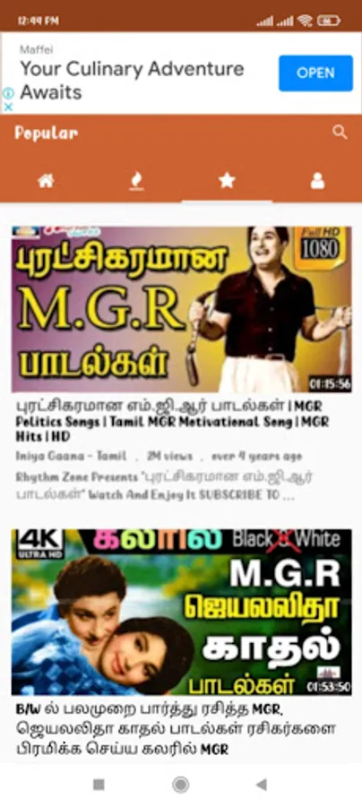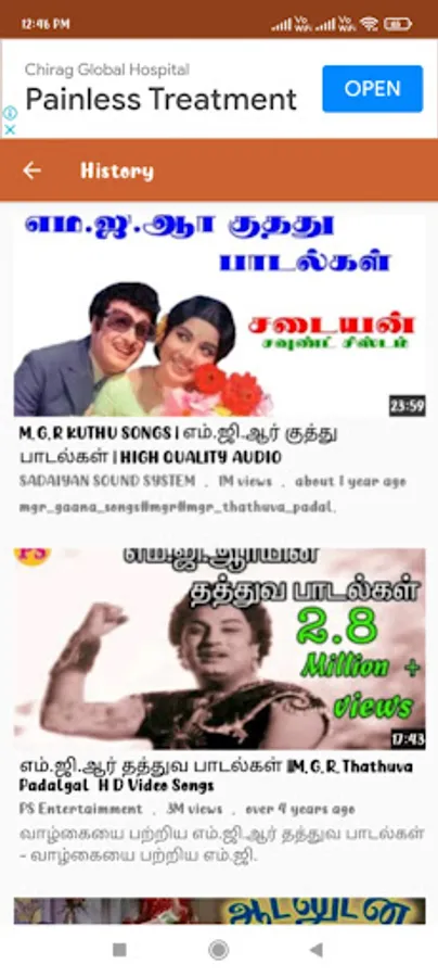 - Your viewed videos are instantly available in history. You may re-watch the best MGR Tamil Old Songs, again and again by visiting your history in the app