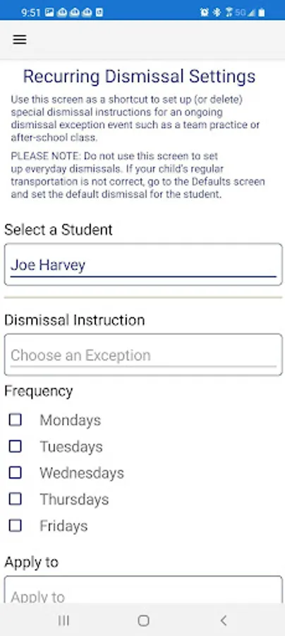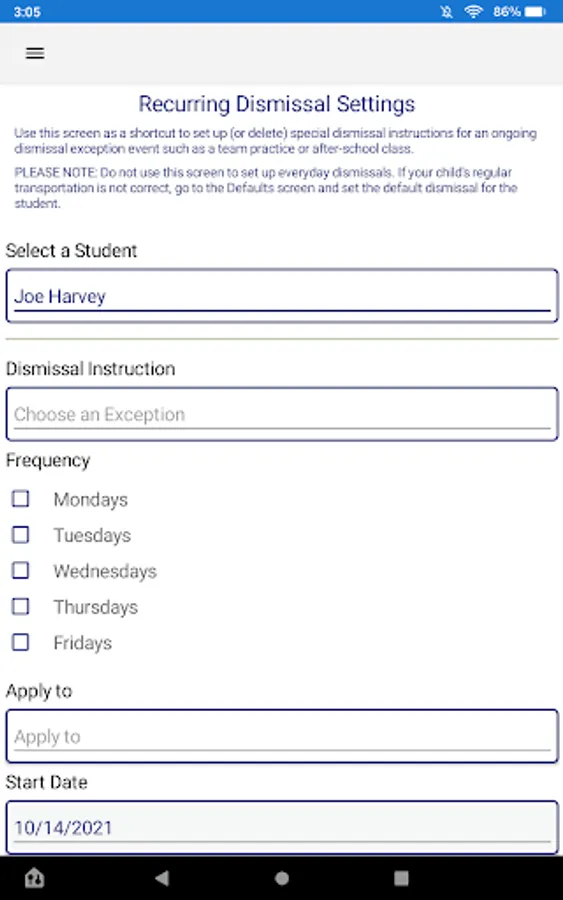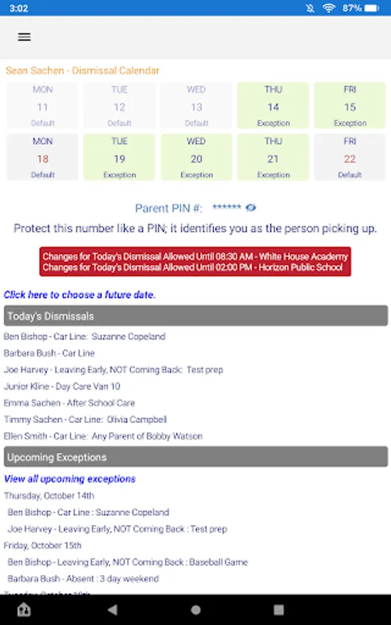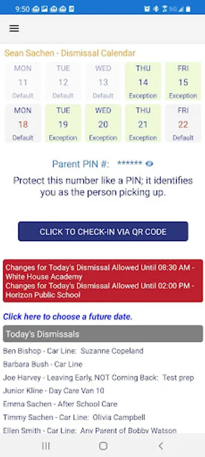 Parents, if your school uses School Dismissal Manager (SDM), this app lets you schedule your child's school dismissal instructions for any day within the next two weeks. Your child's typical everyday instruction is already set, so only exceptions need to be entered.