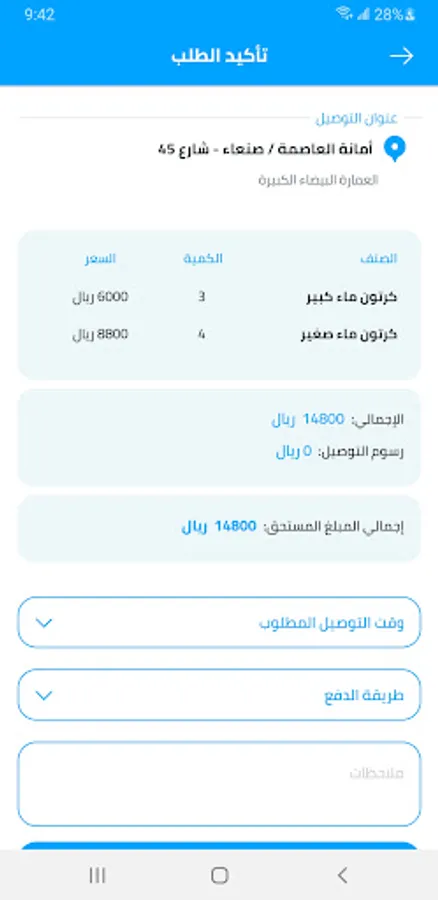 We deliver water alone - Al-Zubayri - Al-Tahrir - Al-Dawri - Al-Siyasi neighborhood - Algeria Street - Amman - Al-Hasba - Old Sana'a - Taiz Street - Khawlan Street - Bab Al-Yaman - Al-Asbahi - Al-Ruwaishan - Baghdad Street - Asr Tour - Libyan City - Al-Mathb Tour - Omran Tour - TV Street - Mazda - Soufan - Al-Rawdah - Al-Jarf - Airport - Noqm - Sheraton - Police College - Mujahid Street - Al-Maqaleh - Sixty-Seventy Street - Presidency - Hale - Rabat - Round 20 - Al-Nasr Street - Aya Tour - Dars - Jumna - Al-Anab - Al-Sananah