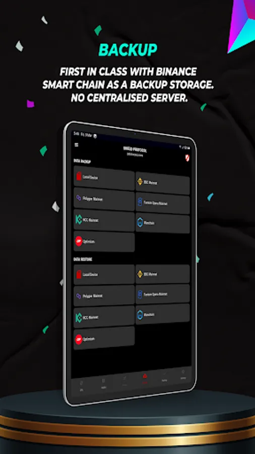 Users can backup and restore their 2FA accounts on Binance Smart Chain, Polygon, Fantom Opera, KCC Chain, WANCHAIN and OPTIMISM Blockchains rather than centralized servers, which also facilitate NO personal data collection of users.