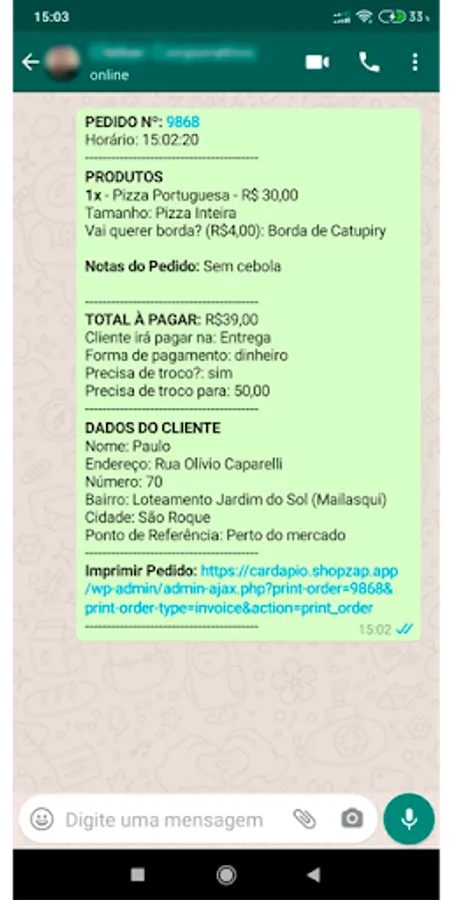 The order arrives directly on your establishment's WhatsApp, that is, you will receive all the necessary information to serve your customer effectively and quickly with the information received fully organized, as follows below:
