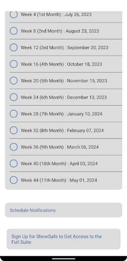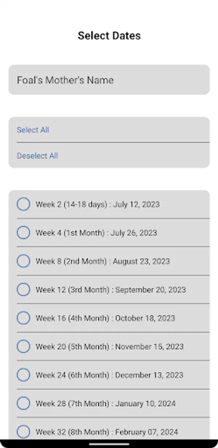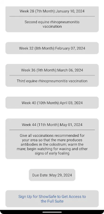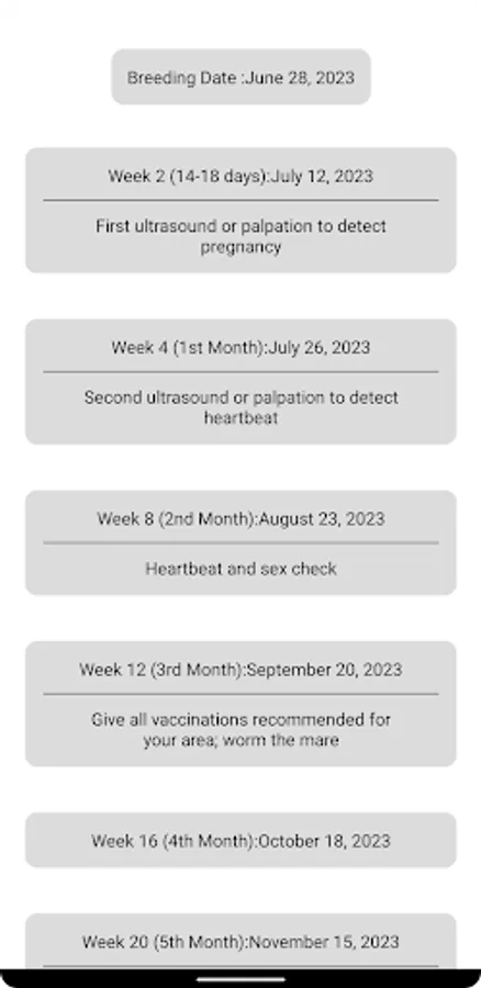 ShowSafe Breeding Calculator is an equine gestation calculator that uses calendar input and optionally schedules notifications based on the recommended events during a horse's pregnancy.