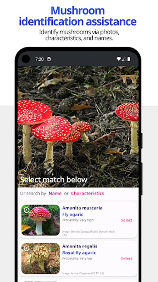 • Mushroom identification assistance. Identify mushrooms via photos, characteristics, and names.
