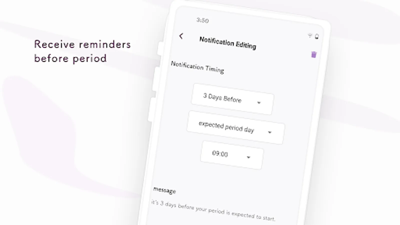 ・Get notifications when your next predicted period is approaching. You can also specify when or how many days in advance you'll be notified.