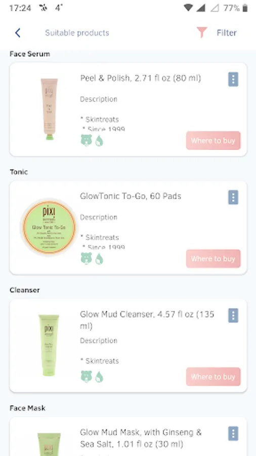 Skincare Expert pays attention for your skin type and state, problems, age, diseases, climate, indoor climate etc. Based on these the application develops a list of recommendations especially for you. If you don't confident about you problems it is not a problem because Skincare Expert allows you to specify any parameters in a lightweight visualised way. After that you give a list of recommended skincare products by categories and are able to buy it on the popular beauty shops.