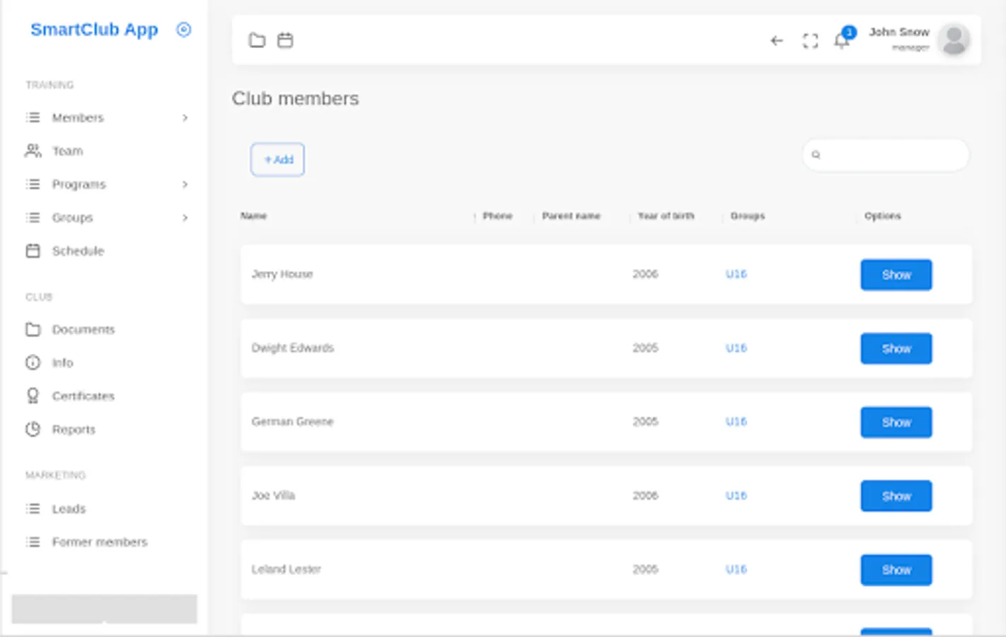 With Smartclub's visual scheduler you can make your team's schedule easily. Also, you can build club's knowledge base by uploading useful documents and links to the app. SmartClub includes lead management too. If you print certificates for your members, no worries, we automated that too.