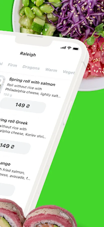 The restaurant's menu includes dishes from different counties - sushi, pizza, BBQ, bowls, salads, rice and noodles with meat and seafood.
