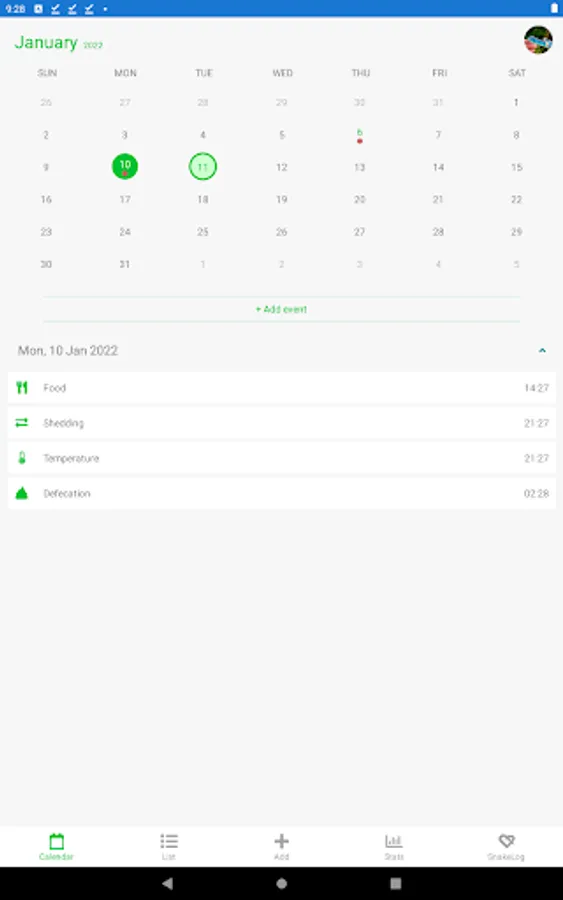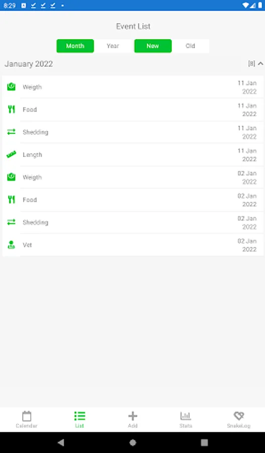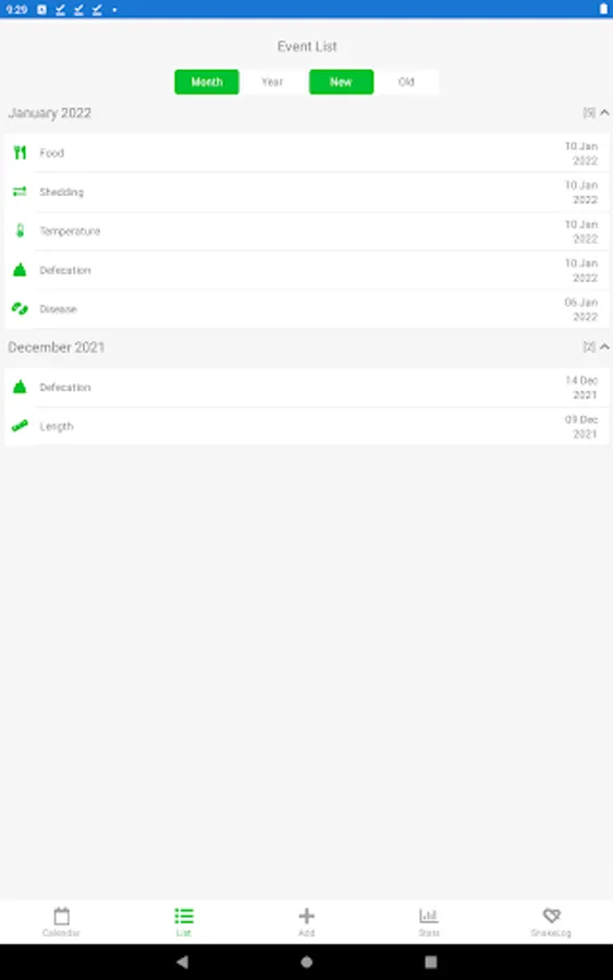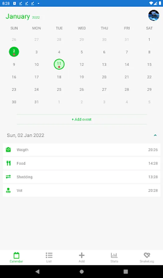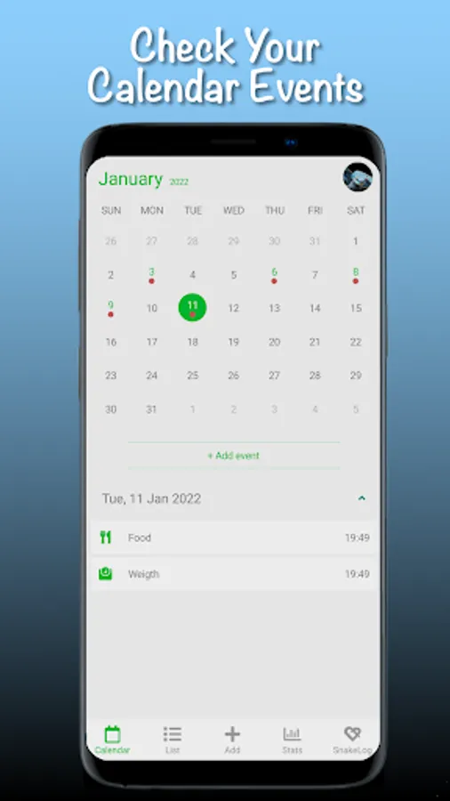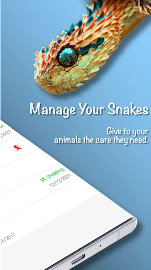 This App gives you everything you need to control and manage your snakes and reptiles, keep track of everything your reptiles need and never miss your feeding time, add all of your snakes or reptiles to the app and manage all their needs. The app is packed with all kind of events, if you need a custom event just create it, the possibilities are endless, advanced statistics are available to track your reptiles evolution, view how often your snakes shed, when did they last reject food and keep track of their weight.