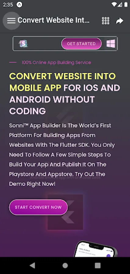 Sonni™ App Builder Is The World’s First Platform For Building Apps From Websites With The Flutter SDK. You Only Need To Follow A Few Simple Steps To Build Your App And Publish It On The Playstore And Appstore. Try Out The Demo Right Now!