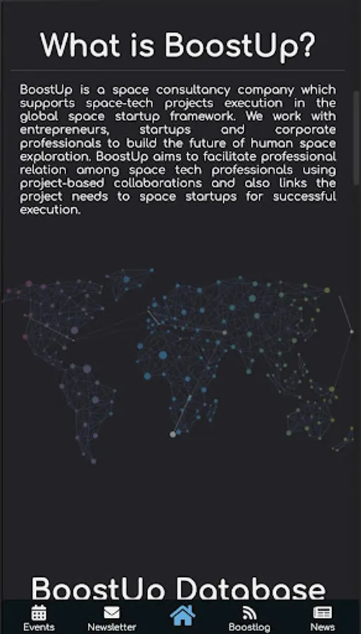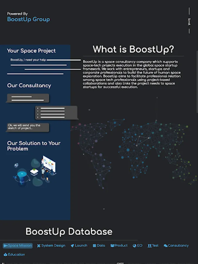 BoostUp is a space consultancy company that supports space-tech project execution in the global space startup framework. We work with entrepreneurs, startups and corporate professionals to build the future of human space exploration. BoostUp aims to facilitate professional relation among space tech professionals using project-based collaborations and also links the project needs to space startups for successful execution.