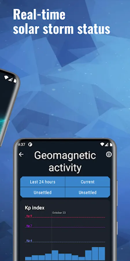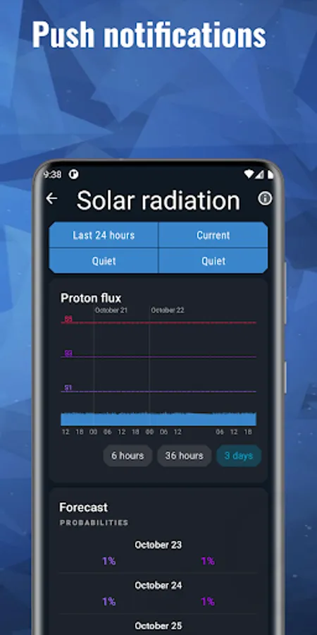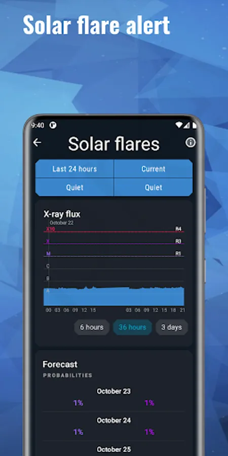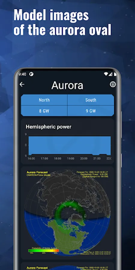 The app shows the current solar activity, solar flares, proton events and the location of the auroras.