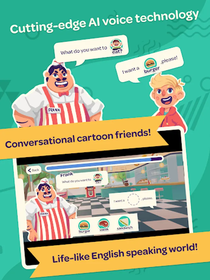 Cutting-edge voice technology transports your child to a life-like English world with conversational cartoon friends!