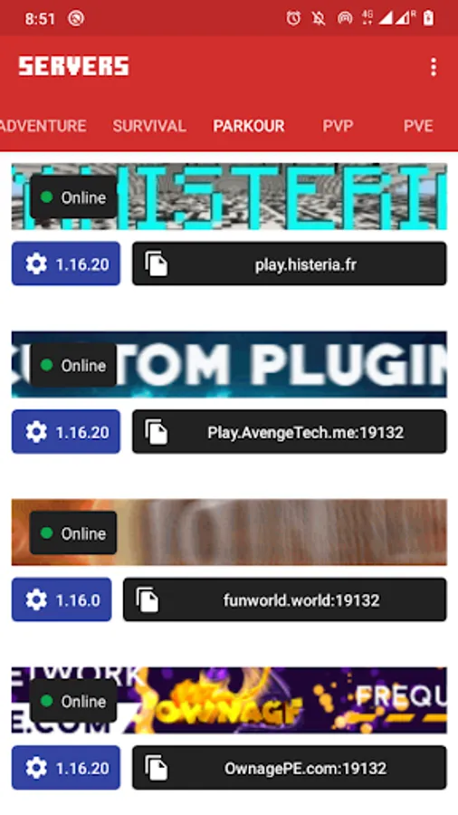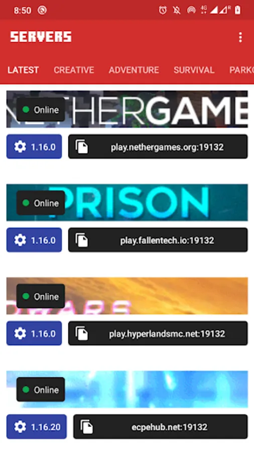 The app contains countless Minecraft PE servers to choose from, servers are available in any countries around the world. Choose the best server for your location with a single tap.