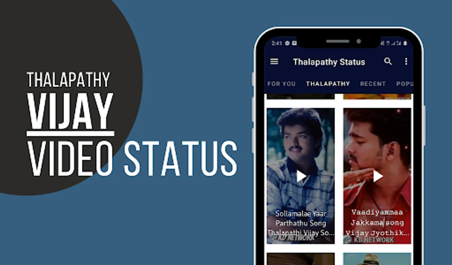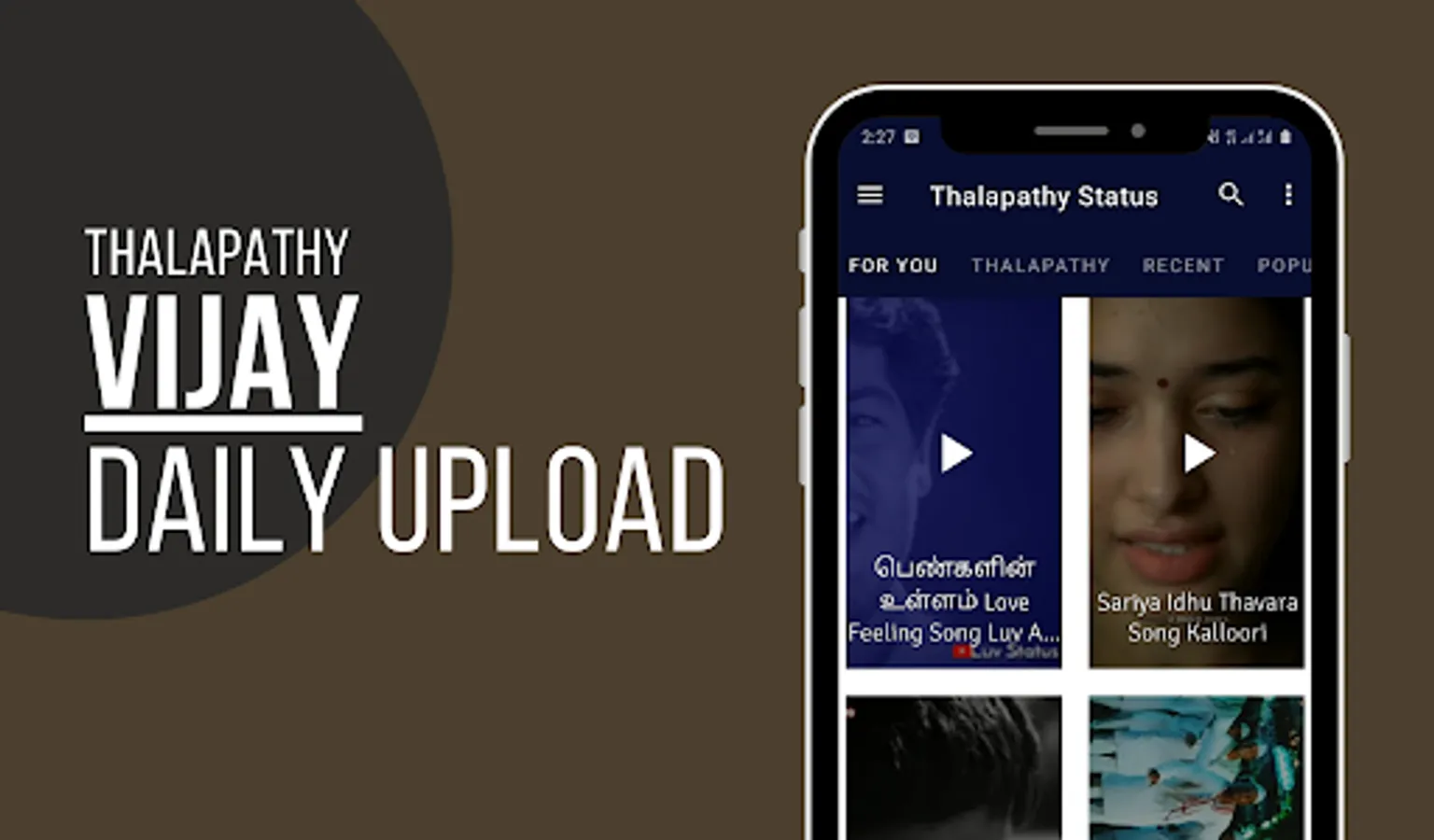 Tamil VidStatus offers variety of category short videos for your social media status or for entertainment. Our Tamil video status app is easy to use and impressive UI design allows you to navigate through videos very easily.