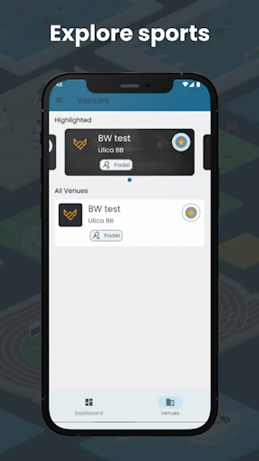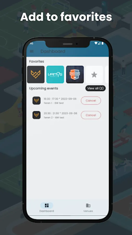 1.Dashboard tab—This is where you can see your favourite venues and the upcoming reservations. You can add a venue to Favourites simply by tapping the star next to its name. Thus, you make it easily accessible from your Dashboard. Click one of the Favourites, choose a vacant time slot, and make a reservation hassle-free. The Upcoming reservations section gives you a clear overview of all your sports-related plans.