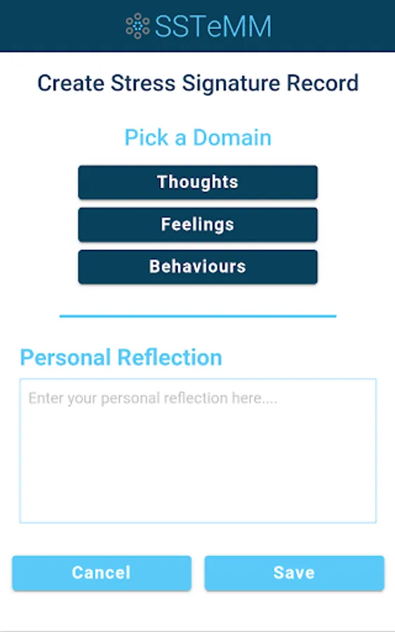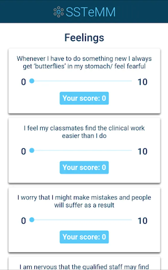 There are three ‘stress domains’ in the SSTeMM app (‘thoughts’, ‘feelings’ and ‘behaviours’). Five questions are found in each domain (for example, “I worry about college work all the time”). You self-assess your stress against each question on a scale of 0-10 and look at the change in your scores over time.