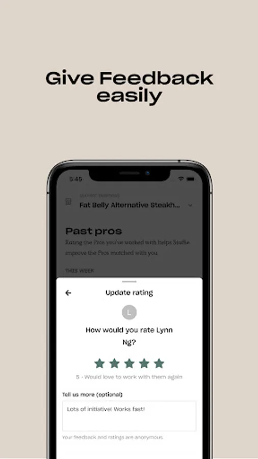 Your shift is instantly sent to hundreds of Pros. Staffie handles the responses and notifies you when a Pro has accepted the shift.
