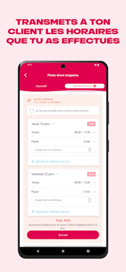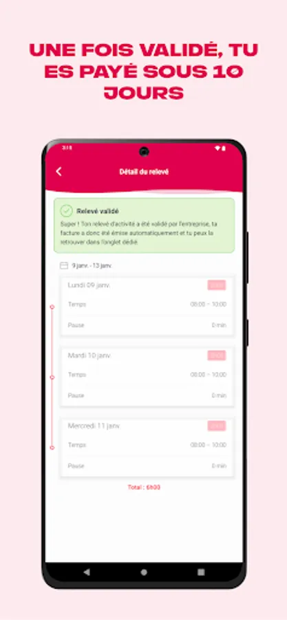From the application, simply complete your working hours once your service is over. StaffMe Freelance then takes care of editing your invoice and sending it to your client. You are informed in real time of the payment thereof.