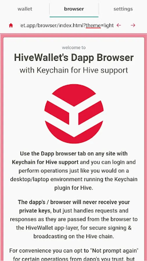 - Use the Dapp optimized browser to browse the Hive ecosystem and securely perform activities on the Hive blockchain through the HiveWallet via Keychain for Hive enabled websites.