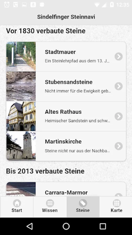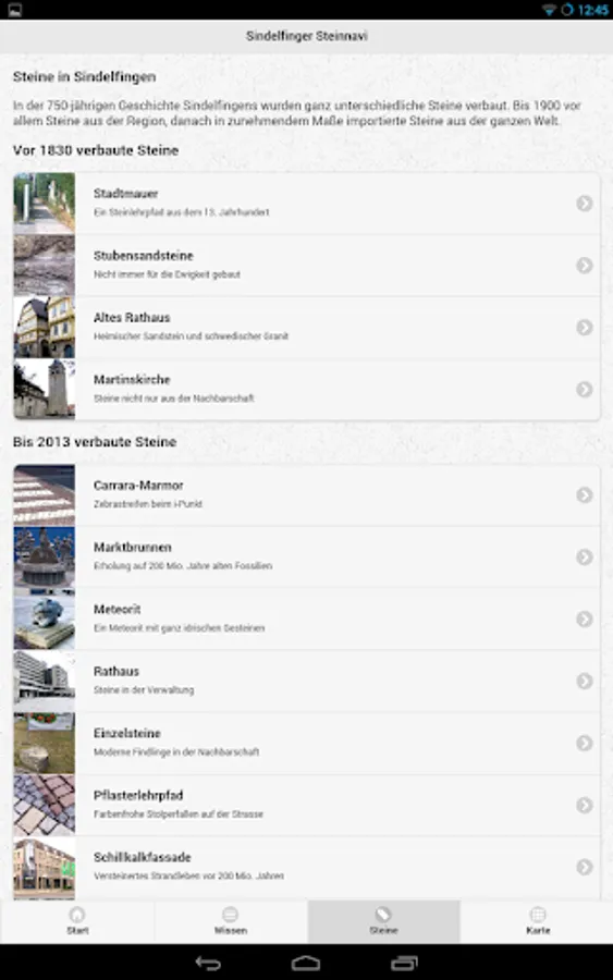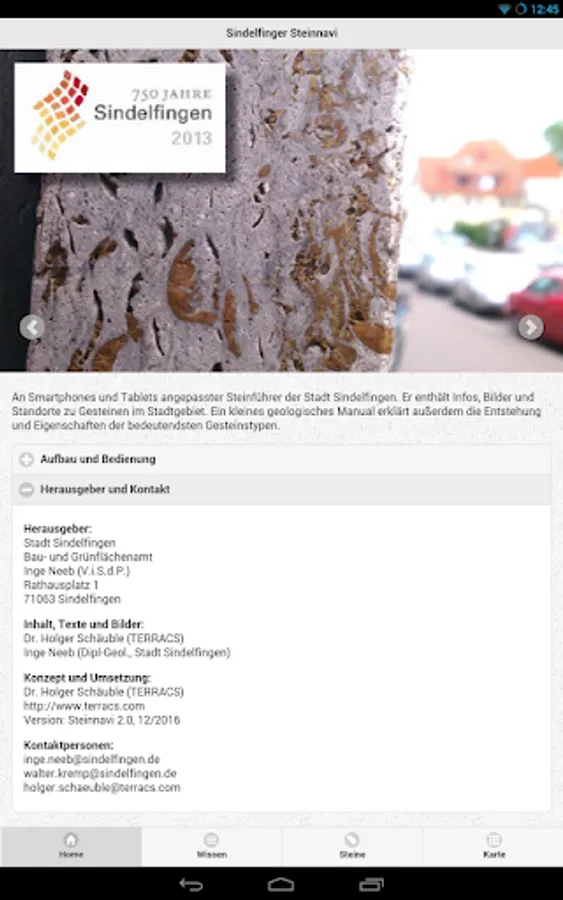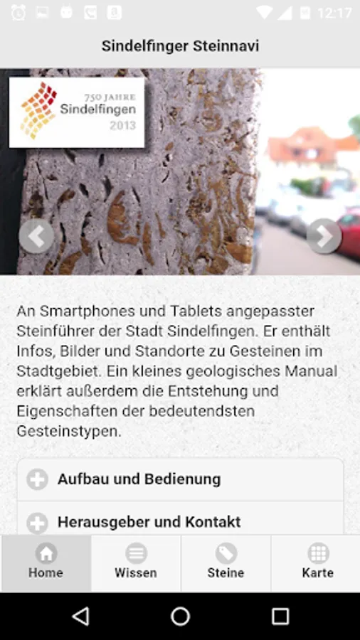 For 750 years Jubilee City Sindelfingen has released a mobile rock leader for smartphones and tablets. It contains information, pictures and coordinate on major rocks and a rock leader who explains the key differences and features.