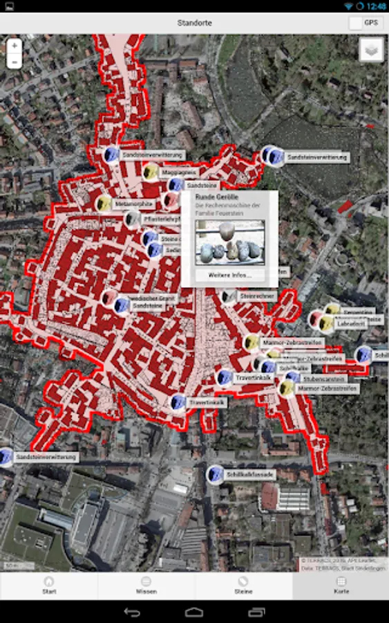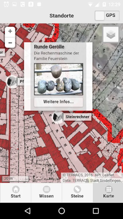 The locations of the stones are displayed in an interactive map and can be found easily with the GPS of the smartphone. The map is divided into two parts: on a recent satellite image of original map from 1830 is displayed. In this way, even "GPS time travel" in the old historic center in Sindelfingen from 1830 possible ...
