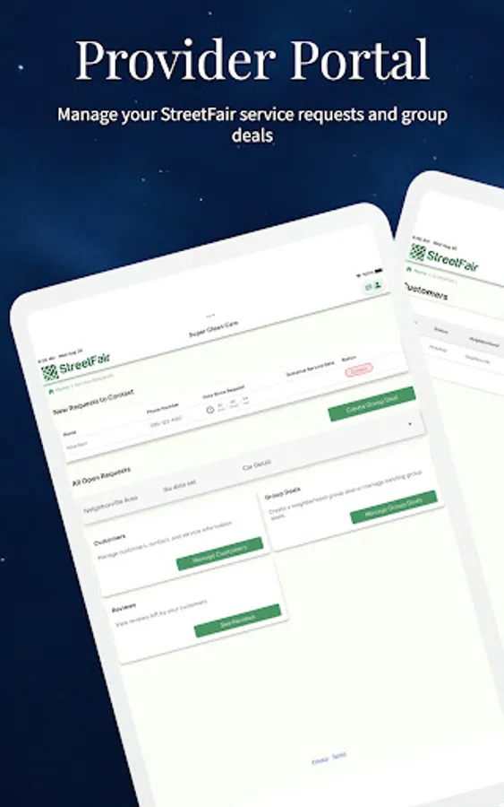 StreetFair is an online marketplace for neighborhoods that allows users to find and hire local home maintenance businesses based on who their neighbors already use and trust. Users can see the top local companies that do work in the neighborhood and join in on upcoming services already scheduled by their neighbors. As more neighbors sign up for the same service, the price goes down for everyone (group discount). Consumers get high quality services based on recommendations from their neighbors, Service Providers gain efficiency through route density (customers that live close together), and collectively neighborhoods can reduce traffic and lower their carbon footprint!