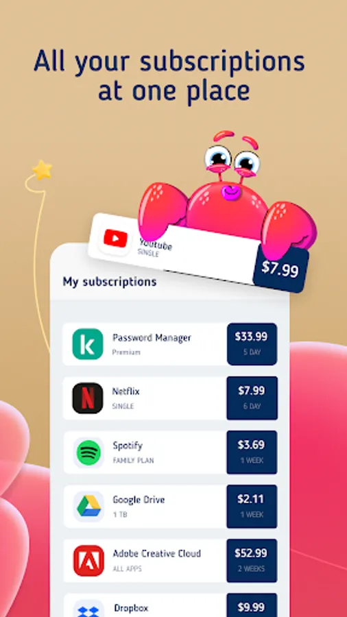 SubsCrab is a handy subscription manager app that organizes your subscriptions and recurring payments. A wonderful subscription tracker which makes it easy to manage your regular expenses.