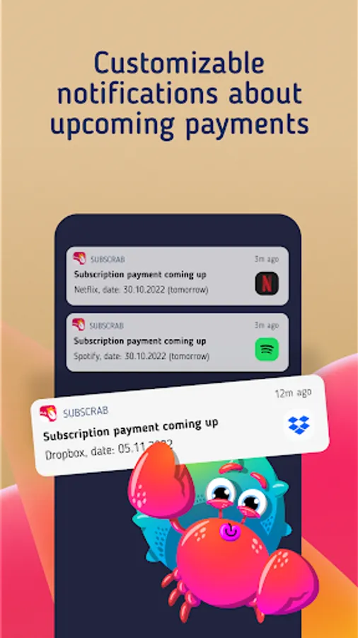 Warning for every subscription spend. In the subscription currency you specified. Subscription tracker lets you set push notifications for every subscription to give you an opportunity to cancel any service you don't need anymore — directly from the SubsCrab app!