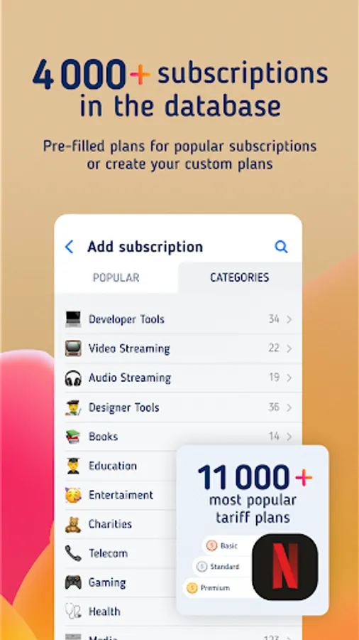 🗃 More than 11,000 subscriptions in our catalog and about 4000 services with available subscription plans. We prepared a database with available subscription plans for the most popular services. All services are divided into categories for quick searching. If you can't find your subscription or plan, it's possible to make your own one.