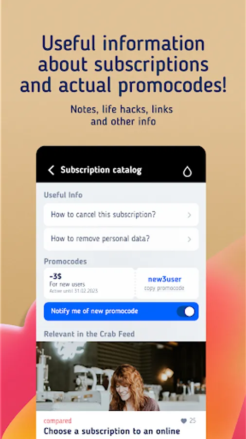 SubsCrab is a subscription manager expenses planner, debt tracker and money saving. With the help of the application, you can confidently manage subscriptions, track spending, save money. And all these for free!