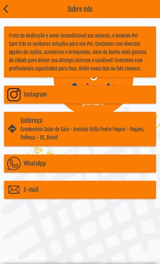 As a result of dedication and unconditional love for animals, Animale Pet Care brings the best solutions for your pet. We have several options for food, accessories and toys, in addition to the tastiest bath in town to make your AUmigo fragrant and healthy! We have trained professionals to tosa. Visit our store or talk to us.
