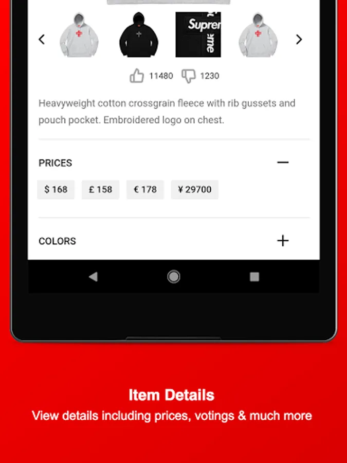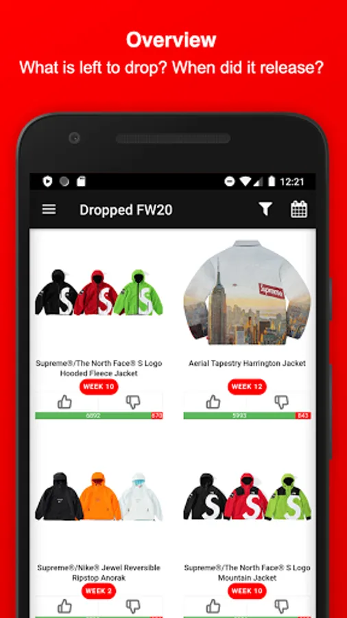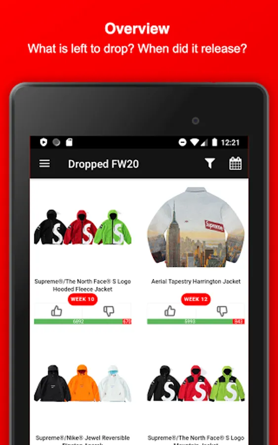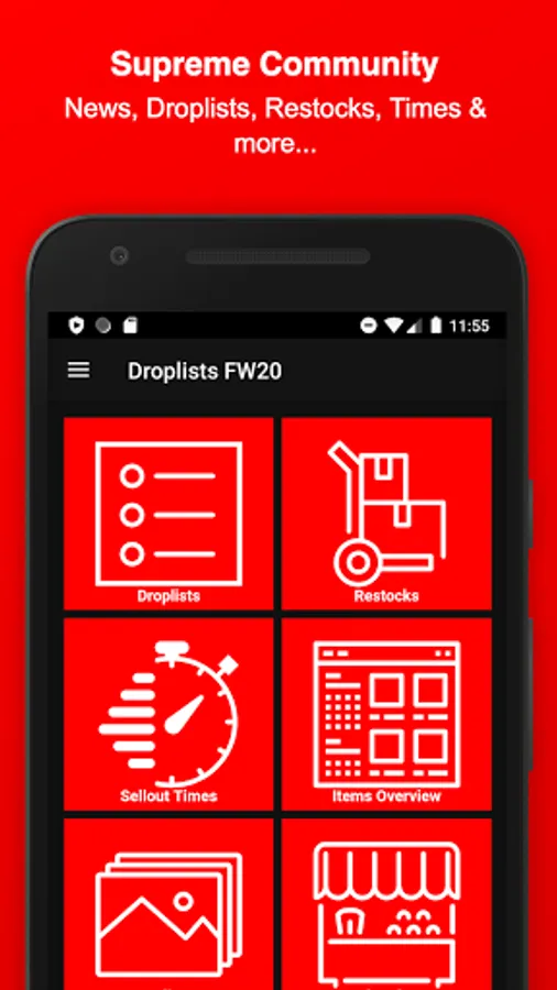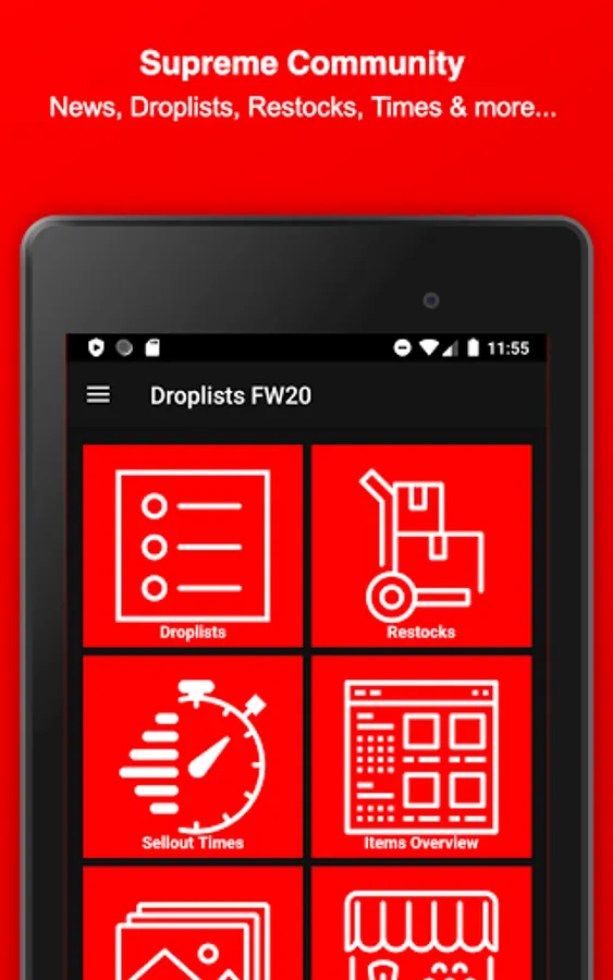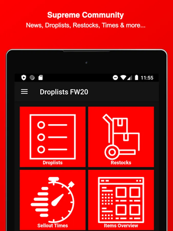 Stay informed about Supreme and download this Fan-App - Find out what might be dropping on Thursday, get notified about Restocks of already sold-out items, view which item sold-out the fastest, upvote your favorite Season items, dig in the item history of Supreme, attend awesome Giveaways & get to meet new people and communicate with the Supreme community and culture.