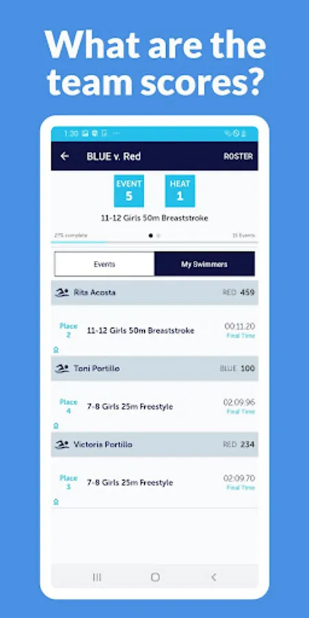 4. Live team scores. Your Swimmingly team scores sync to SwimminglyFan!