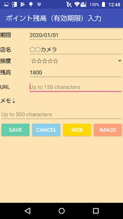 You can only enter the expiration date, store name, usage frequency, balance, URL, and memo.