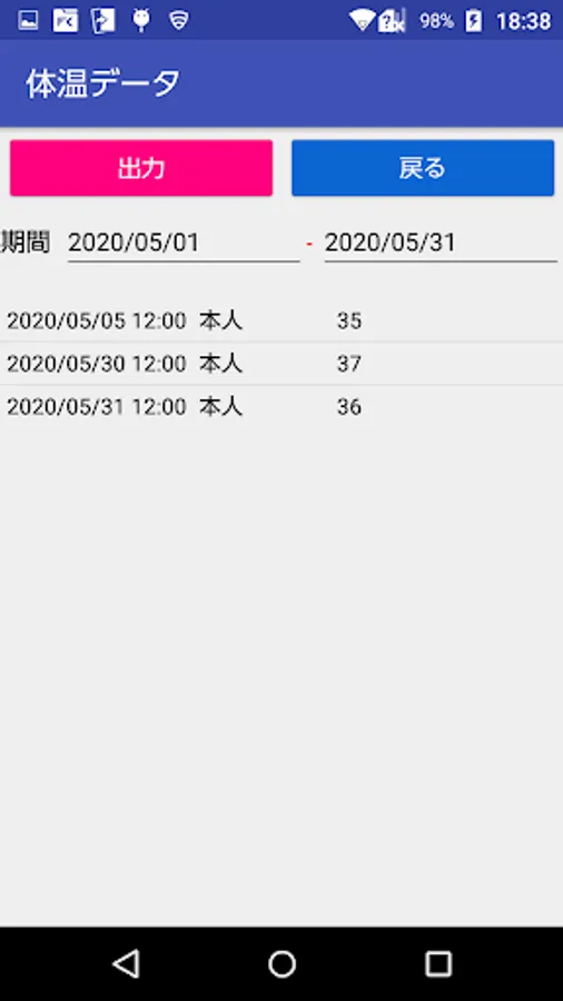 You can check the registered body temperature table on the [Body temperature registration] screen.