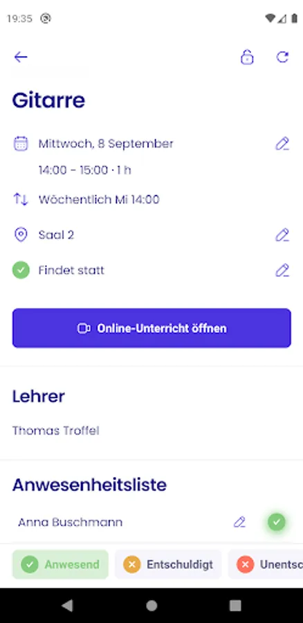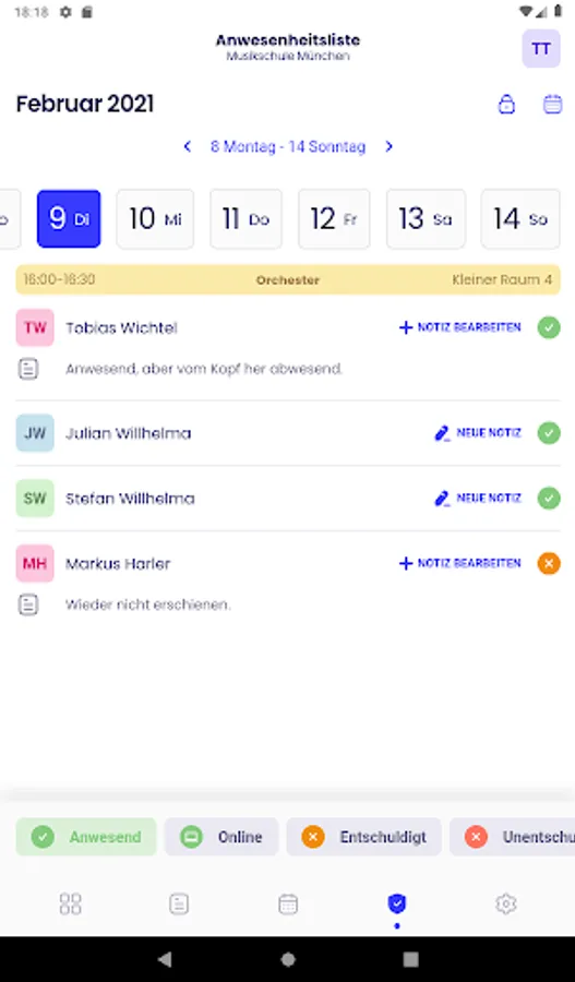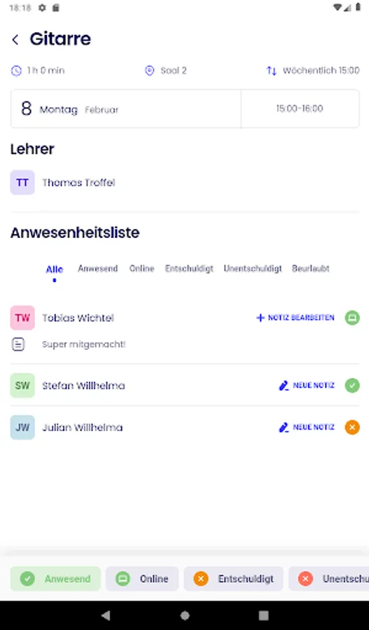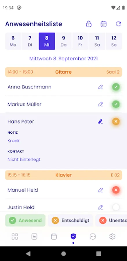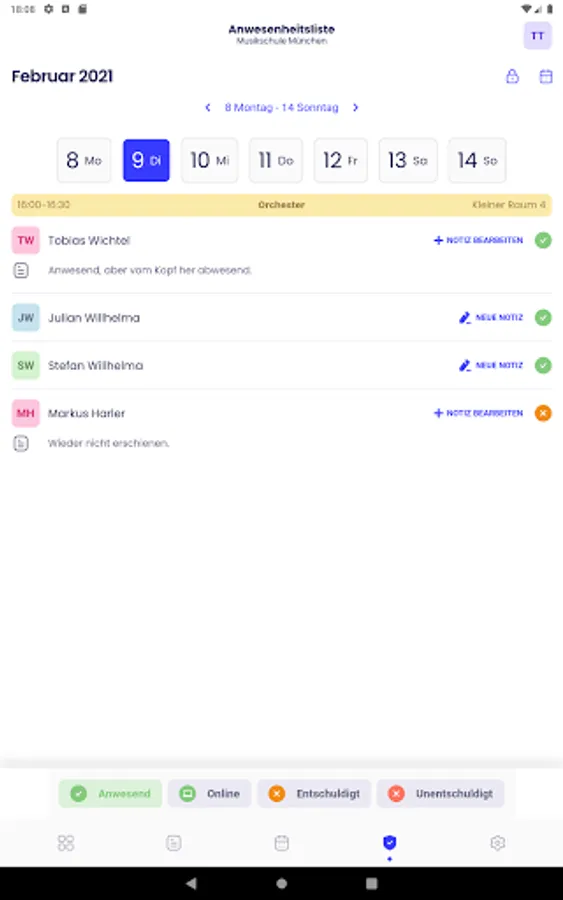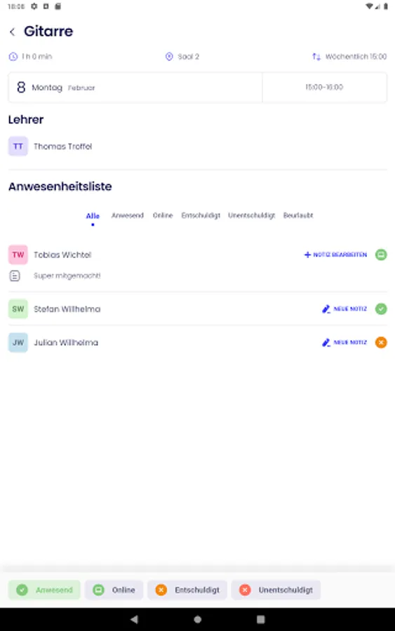 Teachers record attendances digitally in the app and can add a note to each attendance. In doing so, the attendance list is always up to date. The administration can view the attendance lists at any time.