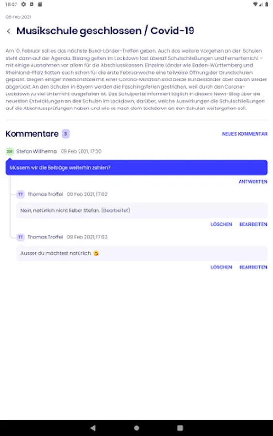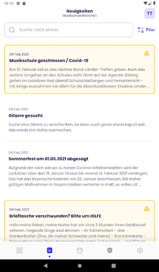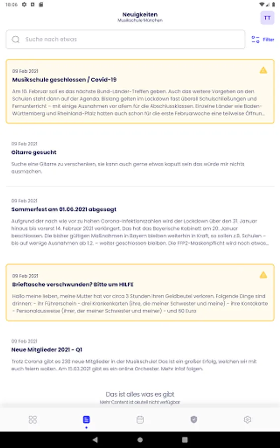 Important information and upcoming events can be entered here. When news arrives, users receive a notification. Also, users can comment on the news.