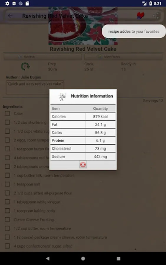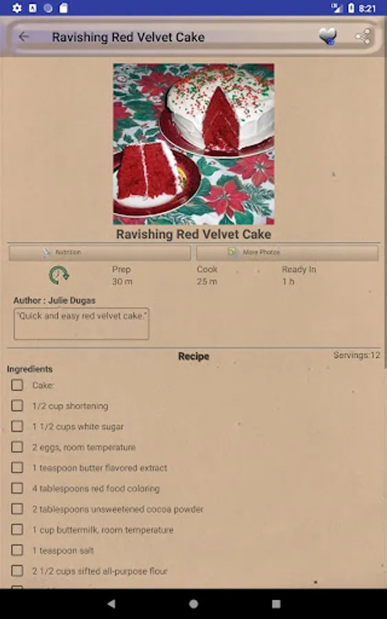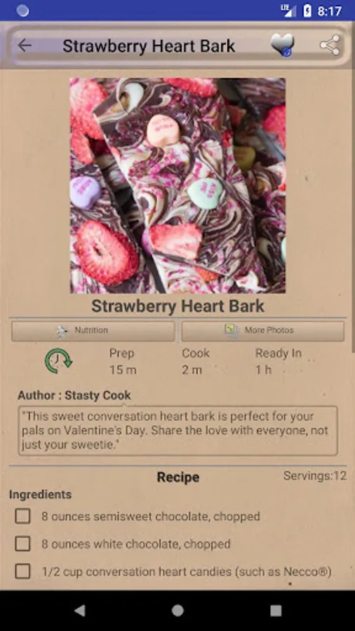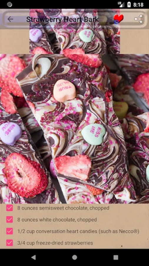 Valentine's Day Recipes ~ Tasty romantic recipes app is a comprehensive cookbook with variety of delicious and healthy recipes. Valentine's Day Recipes ~ Tasty romantic recipes have Quick and easy recipes and homemade recipes. We provide you the best Valentine's Day Recipes ~ Tasty romantic recipes which you will love to cook or prepare. All recipes are yummy and tasty. Even kids can prepare delicious Valentine's Day Recipes ~ Tasty romantic recipes very easily using this free app. This application is completely free for all time. "My nice recipes" provides you the best recipes.