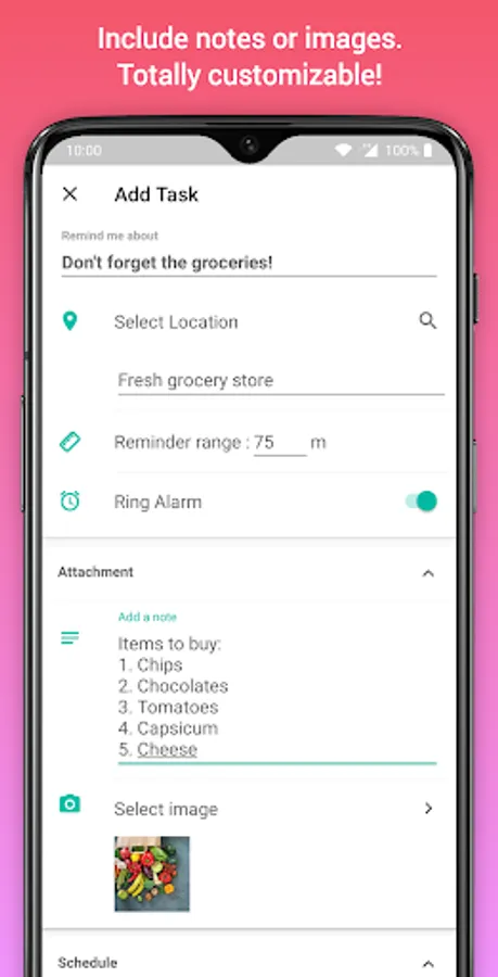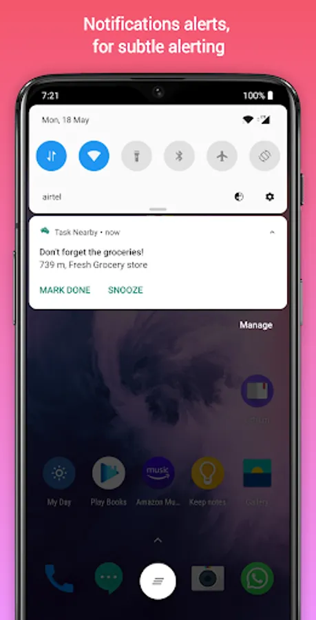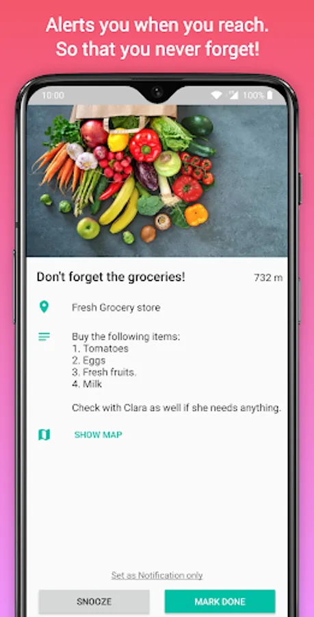 Just tell Task Nearby the reminder details and it’ll auto-magically remind you when you reach there.